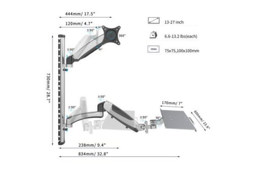 Univerzální nástěnný držák s flexibilním nastavením pracovní výšky pro montáž monitorů a klávesnic. Nastavte pracovní prostor, který mohou používat lidé různých výšek - pracovní výšku můžete snadno nastavit pomocí dvou rychlých pohybů. Jednoduše si všimněte velikosti VESA a hmotnosti monitoru, abyste mohli vybrat vhodný držák.