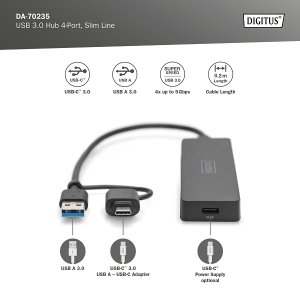 Rozbočovač DIGITUS USB 3.0 Hub Slim Line je ideálním rozšířením pro každé pracoviště. Až čtyři zařízení USB lze připojit a používat současně, což usnadňuje použití více vstupních zařízení nebo přenosných úložných zařízení. Díky technologii USB 3.0 dosahují datové přenosy rychlosti až 5 Gbps a zajišťují nejrychlejší výměnu dat. Díky tenkému designu je 4portový rozbočovač ideálním společníkem na cestách, ale je také nepostradatelný v domácnosti a kanceláři.