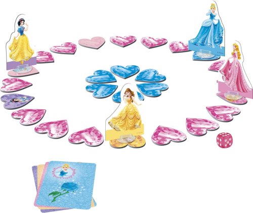 26 karet herního plánu ve tvaru srdce 16 hracích karet s plesovými doplňky 4 kartónové figurky princezen 4 stojánky 1 bodovou hrací kostku