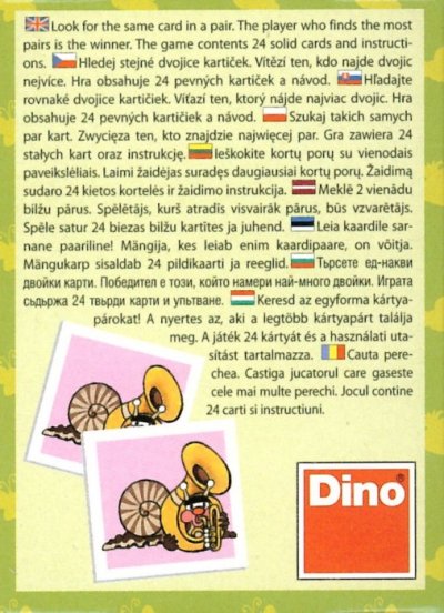 Hra obsahuje: 12 dvojic - celkem 24 kartiček, návod ČESKÝ VÝROBEK od české firmy Dino Toys. Společnost Dino Toys spolupracuje s významnými výtvarníky, grafiky a vynálezci. Klade důraz na nejvyšší kvalitu obsahu, výtvarného zpracování a technického provedení jednotlivých výrobků. Tato firma se zabývá nakladatelskou činností v oblasti her, puzzle a obrázkových kostek.
