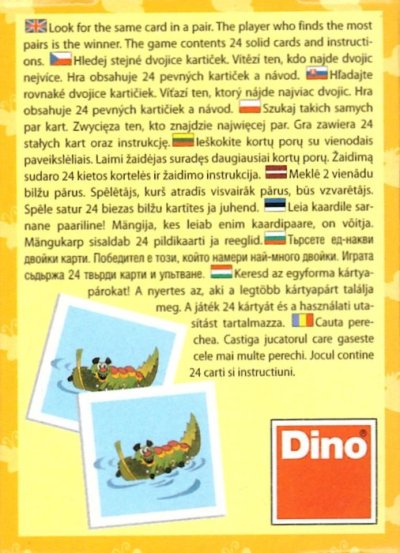 Hra obsahuje: 12 dvojic - celkem 24 kartiček, návod ČESKÝ VÝROBEK od české firmy Dino Toys. Společnost Dino Toys spolupracuje s významnými výtvarníky, grafiky a vynálezci. Klade důraz na nejvyšší kvalitu obsahu, výtvarného zpracování a technického provedení jednotlivých výrobků. Tato firma se zabývá nakladatelskou činností v oblasti her, puzzle a obrázkových kostek.