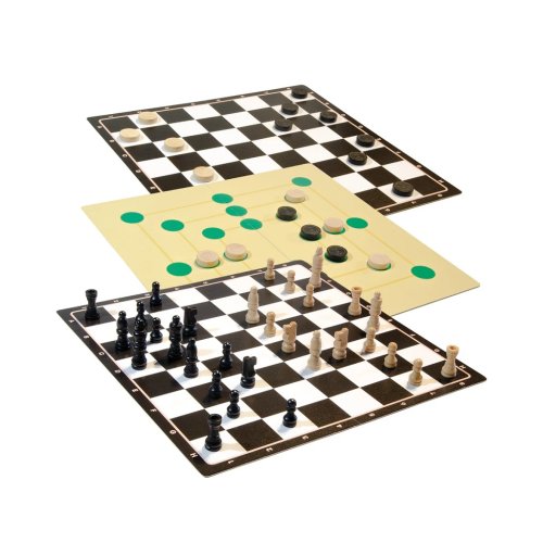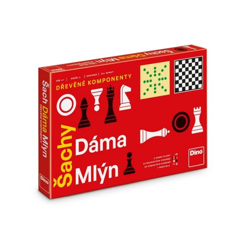 Tradiční hry šachy, dáma, mlýn s dřevěnými komponenty. Věk 6+.