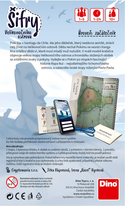 Domorodci mu říkají Rapa Nui. Vy ho znáte jako Velikonoční ostrov. Hlavně díky moai – sochám s obřími hlavami, rozmístěnými různě po celém ostrově. Náš příběh je o studentovi rapanuiské kultury ze Santiaga de Chile jménem Poki, jehož dědeček ještě do nedávna na ostrově žil. Dědeček však zemřel a Pokimu ve vesnici Hanga Roa zanechal malou modrou krabičku... Otevřete krabičku a užijte si pořádnou šifrovací hru na doma. Tedy společné luštění záludných úkolů, u kterých rozhodně platí, že víc hlav, víc vymyslí. Zkrátka očekávejte devět pečlivě připravených šifrovacích stanovišť. Celou hrou vás navíc provede propracovaný online herní systém od Cryptomanie – špičky na české šifrovací scéně.