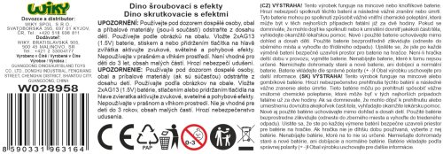 Dino šroubovací s efekty tyranosaurus. Rozměry 12,5x5,5x13 cm. Dinosaurus po zmáčknutí hřebínku na hlavě otevírá tlamu a koulí očima, při přidržení svítí. Vydává zvuky. 2xAG13 baterie součástí balení.