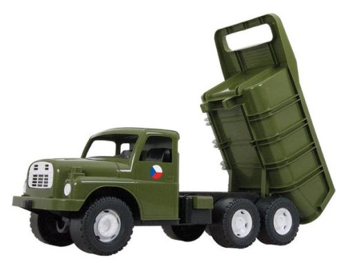 Sklápěcí auto Tatra 148 v khaki zeleném provedení - velké a robustní plastové autíčko s pojistkou proti nežádoucímu vyklopení korby. Děti do ní mohou bezpečně usednout a vozit se.