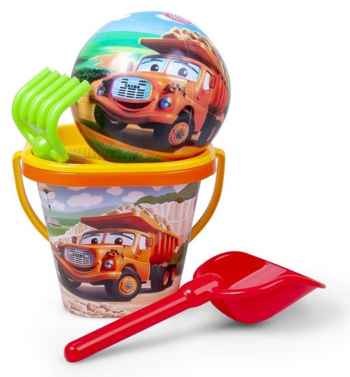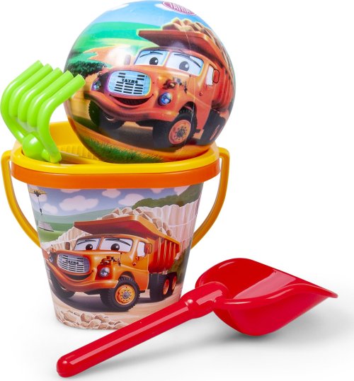 Pískový set obsahuje kyblík se sítkem, lopatku, hrabičky a míč 15 cm s ilustracemi Tatry.