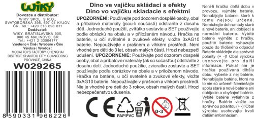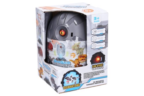 Dino ve vajíčku skládací s efekty. Vajíčko obsahuje díly na složení dinosaura a návod. Součástí jsou oči do nichž se vkládají baterie - svítí a vydávají zvuk. Oči jsou jedním z dílků skládačky dinosaura. 4 varianty - tyrannosaurus, velociraptor, ankylosaurus, brachiosaurus.