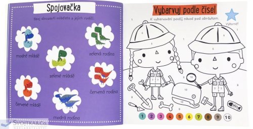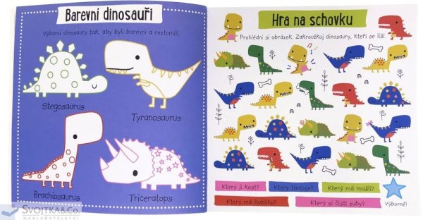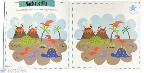Vstup do dávných a tajemných časů doby prehistorické! V této krásně ilustrované knížce na tebe čeká více než 75 různých pěnových nálepek dinosaurů, zkamenělin, sopek, ale i zvědavých paleontologů. Kromě zábavných her s nálepkami je kniha plná spojovaček, hledání rozdílů, a dokonce i zapeklitých bludišť, které můžeš dozdobit samolepkami a dokreslit dle vlastní fantazie. A po splnění každého úkolu si můžeš za odměnu nalepit hvězdičku na určené místo. Nálepky, které nevyužiješ, si samozřejmě můžeš nalepit, kamkoliv budeš chtít.Takže pastelky do ruky a hurá na to!