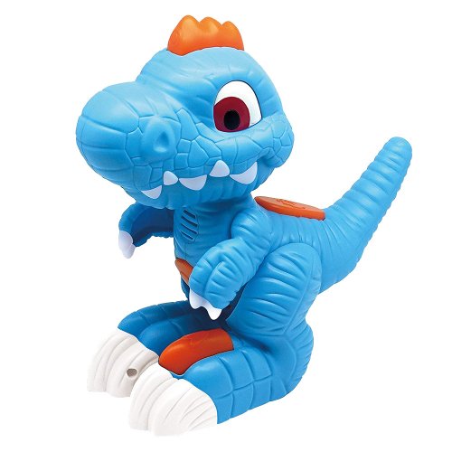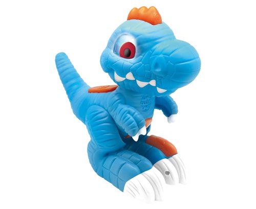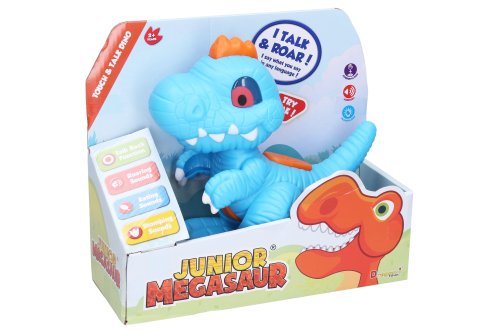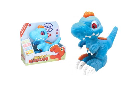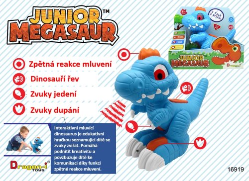 S mluvícím dinosaurem si užiješ mnoho zábavy! Po zmáčknutí tlačítka na zádech vydává pravý dinosauří řev! Když mu zmáčkneš bříško, tak se zase ozývají zvuky jako při jídle! A co noha? Zmáčkni s poslouchej, jak se ozývá dinosauří dusot! Nejlepší však přijde nakonec! Zmáčkni hřebínek! Aktivuješ tak funkci nahrávání a dinosaurus bude opakovat tvá slova!