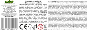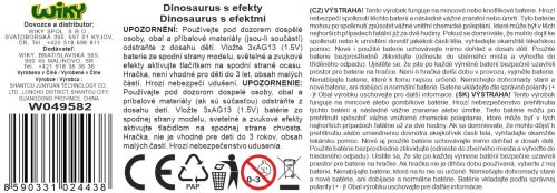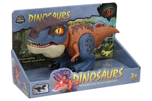 Dinosaurus s efekty hnědý. Rozměry 26,5x11x13 cm. Světelné a zvukové efekty tlačítkem na spodní straně ocasu (vysune hlavu a otevře tlamu s efekty). 3xAG13 baterie součástí ze spodní části těla. Manuálně otevírací tlama, pohyblivá a dopředu vytahovací hlava, pohyblivý ocas, přední a zadní končetiny.