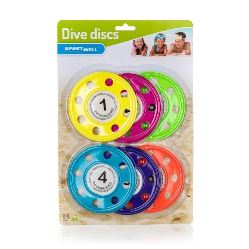 Ppotápěcí disky SPORTWELL jsou skvělou pomůckou pro výuku plavání i zábavu ve vodě. Balení obasahuje kroužky šesti barev. Doporučený věk od 3 let.