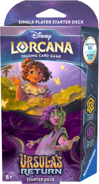 Každý startovací balíček Disney Lorcana obsahuje vše, co hráč potřebuje, aby mohl začít hrát proti jinému hráči, který má svůj vlastní balíček. Díky těmto balíčkům hráči poznají bohatý příběh a rozmanité postavy hry Disney Lorcana. Pro sadu Disney Lorcana: Ursula's Return jsou k dispozici dva startovací balíčky. Každý balíček má 60 karet a obsahuje karty dvou inkoustů, z nichž každý má svůj vlastní herní styl. Jedná se kombinace jantarového inkoustu s ametystovým a safírového s ocelovým. Každý startovací balíček obsahuje: •1 předpřipravený balíček o 60 kartách včetně 2 prémiových fóliových karet •11 herních žetonů •1 papírovou hrací podložku •1 papírový sledovací žeton •pravidla pro rychlý start •1 bonusový booster pack s 12 náhodně vybranými kartami Tento balíček obsahuje loajální a empatické jantarové postavy zaměřené na podporu svých spoluhráčů a tajemné ametystové postavy, které umí využít magickou sílu a pomoci vám dosáhnout vytyčených cílů. Skvělá volba pro hráče, kteří rádi táhnou karty a rádi mají ve hře spoustu postav.