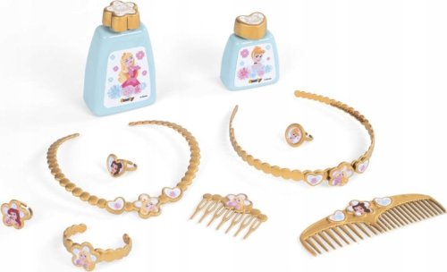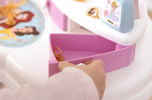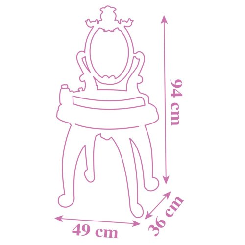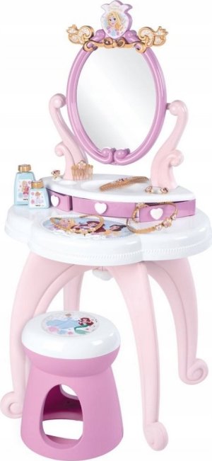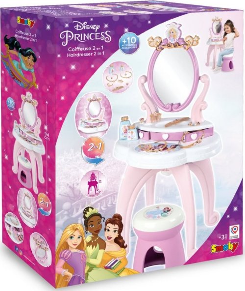 Toaletní stolek s motivem Disney princezen pro malé parádnice, se 3 šuplíčky, 10 ks příslušenství (např. čelenka, hřeben, prstýnky atd.). Součástí otočné zrcadlo a židlička, nosnost židličky 50 kg. Rozměry: 49 x 94 x 36 cm.