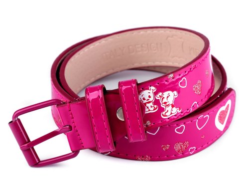 Dívčí pásek v klasickém provedení s kovovou sponou se hodí k jakémukoliv oblečení. Má hladký povrch s leskem, dívky si jej zamilují díky potisku pejsků a srdcí ozdobených jemnými glitry. Pásek se dá zkrátit na potřebnou délku díky šroubku, který je umístěný za sponou.