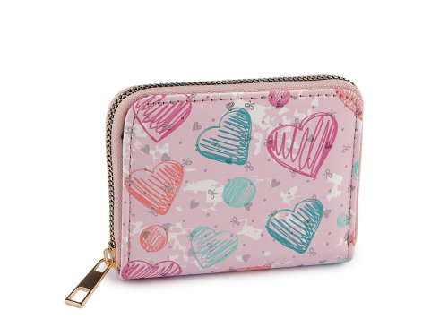 Dívčí peněženka s potiskem srdíček je ideální pro každodenní použití. Upoutá pozornost díky svému třpytu, který způsobují malá metalická srdíčka a mašličky v potisku. Díky kompaktnímu rozměru se snadno vejde do různých typů kabelek či batohů. Zavírá se na zip. Uvnitř najdete hlavní prostor oddělený přepážkou na dva menší. V přepážce je mincovník na zip. Po stranách jsou ještě 4 přihrádky na karty.