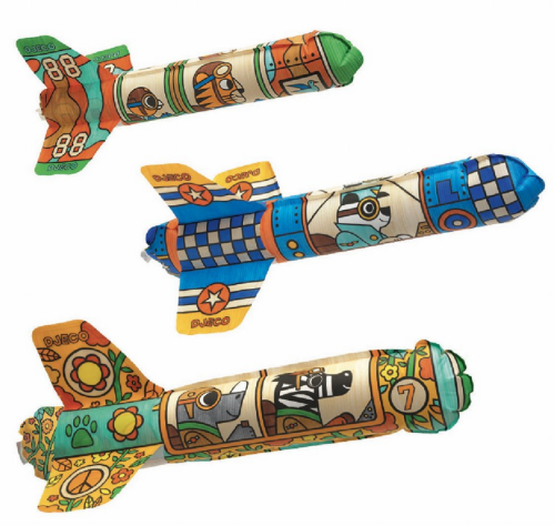 Vybarvi si tři rakety a vyzkoušej, která doletí nejdál! Zábavný set například na narozeninovou párty. Děti se zabaví vybarvováním raket, které pak pomocí přiloženého brčka jednoduše nafouknou a mohou uspořádat raketové závody. Vhodné pro děti od 4 let.