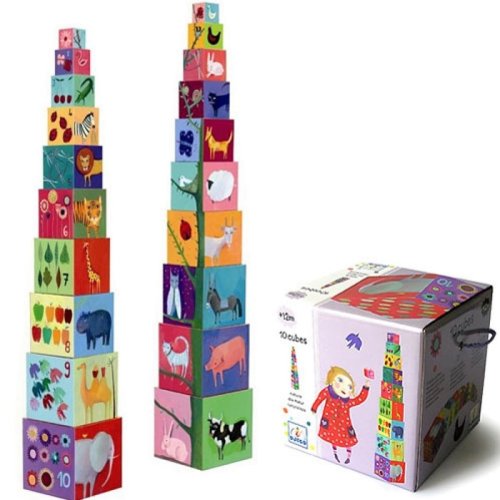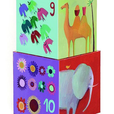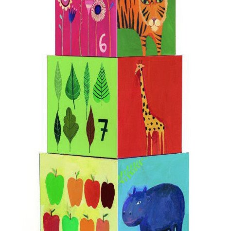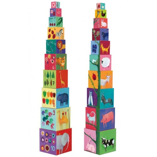 Postavte si krásnou věž s motivy zvířátek a přírody. Kostky můžete stavět na sebe, nebo vkládat do sebe. Na stěnách kostek se může dítě naučit názvy zvířatek, barvy a čísla. Balení obsahuje 10 kostek. Velikost největší kostky 15 x 15 cm. Výška postavené věže je 86 cm.