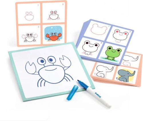 Sada obsahuje šablony, které pomohou děti provést každým krokem kreslení. Pomocí smazatelného fixu mohou začít znovu a znovu. Děti pracují na svých motorických dovednostech tím, že dokončují kresby podle šablon. Pomáhá rozvíjet koncentraci. Vyrobeno z papíru a kartonu s certifikátem FSC®. Balení obsahuje: 24 karet se šablonami, 1 tabule, 1 fix a 1 hadřík na gumu.