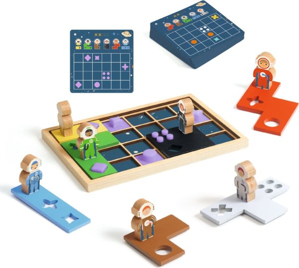 Pouze 1 možné řešení na výzvu. Řešení najdete na konci brožury. 4 úrovně obtížnosti. Téma, které děti milují: vesmír Rozvíjí trpělivost, logiku a dedukci. Dřevo s certifikátem FSC®. Obsah balení: 1 dřevěná vesmírná deska s mřížkou, 7 dřevěných figurek, 13 plastových dílků, 30 oboustranných karet s výzvami, pravidly hry.
