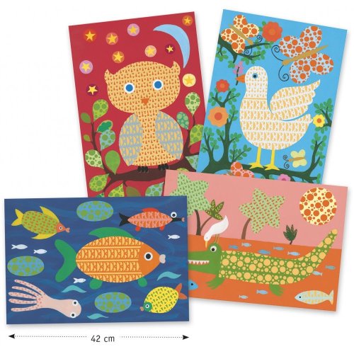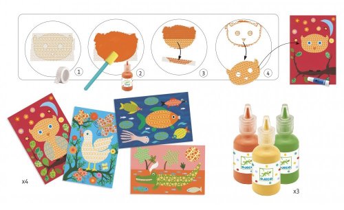 Postup je jednoduchý: Vyberte si pozadí a zvířátko, které budete dokrášlovat. Části zvířátka jednoduše vylomte s arch a umístěte na podložku, na které budete s obrázkem pracovat. Pomocí šablonové pásky a barviček dodejte částem zvířátka osobité zdobení a nechejte zaschnout. Po úplném zaschnutí zvířátko zkompletujte a obrázek je hotový.