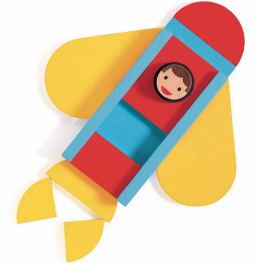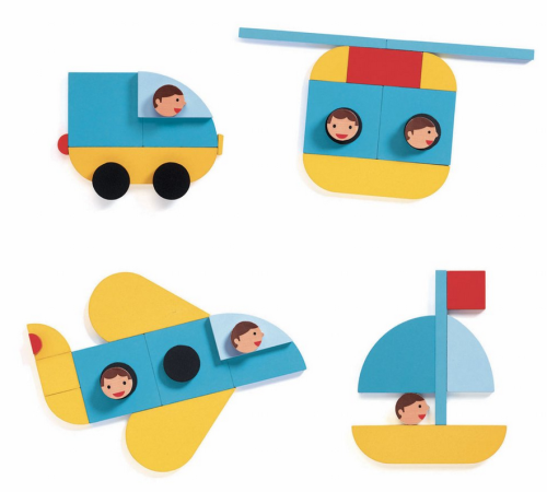 Zábavná razítkovací sada pro děti. Sada obsahuje 33 barevných dřevěných dílků geometrických tvarů, 20 předloh dopravních prostředků a 3 úrovně obtížnosti označené hvězdičkami. Děti se tak postupně učí tvary a prostorové vnímání a mohou si přizpůsobovat obtížnost. Vhodné pro děti od 3 let.