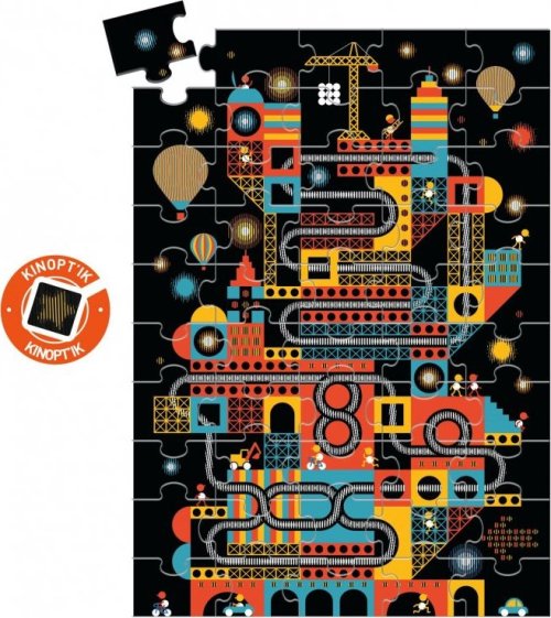 Magnetické puzzle Kinoptik pracují s optickým klamem. Každý obrázek má na sobě řadu čar, které po přejetí přiloženého černého plastu vytvářejí dojem pohybu. Rozměr složeného puzzle cca 34 x 48 cm