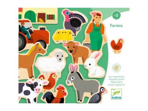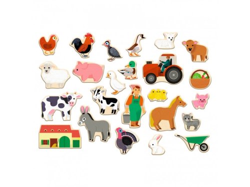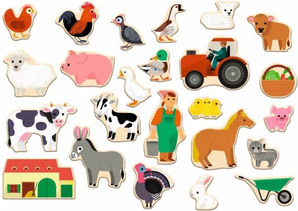 Sada magnetických dřevěných dílků s farmářskou tématikou.