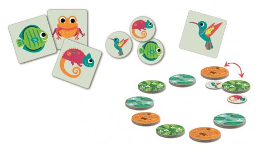 Balení obsahuje 9 zvířecích žetonů, 9 barevných krycích kartiček, 54 karet (27 se zvířátky, 27 akčních karet)