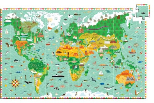 Puzzle DJECO Observation kombinuje skládání s přirozenou dětskou zvědavostí. Procestujte celý svět a poznávejte známé přírodní památky, stavby nebo zvířata. Součástí balení je brožura s informacemi v 10 cizích jazycích. UPOZORNĚNÍ: Přiložená brožura není v češtině,slovenštině, nicméně může sloužit jako učební pomůcka pro výuku cizích jazyků daného tématu, případně jako podklad pro vyhledávání informací. Rozměr složeného puzzle cca 61 x 38 cm