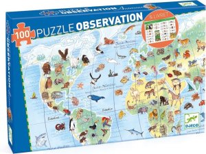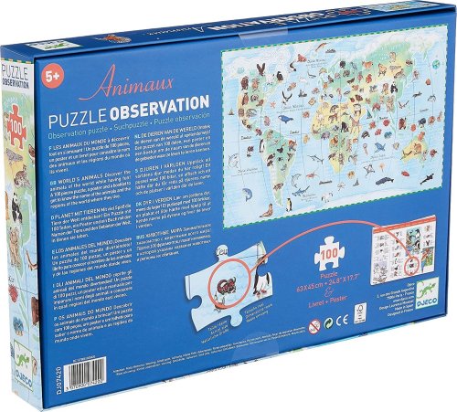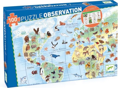 Puzzle DJECO Observation kombinuje skládání s přirozenou dětskou zvědavostí. Procestujte celý svět a objevujte, která zvířata jsou typická pro jaký kontinent. Součástí balení je brožura s informacemi v 10 cizích jazycích. UPOZORNĚNÍ: Přiložená brožura není v češtině,slovenštině, nicméně může sloužit jako učební pomůcka pro výuku cizích jazyků daného tématu, případně jako podklad pro vyhledávání informací. Rozměr složeného puzzle cca 63 x 45 cm