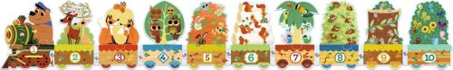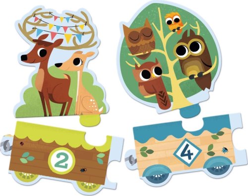 Obrysové puzzle ve tvaru vlaku s lokomotivou a devíti vagóny. V každém z nich se veze jiný počet zvířátek. Zatímco ve vagónu číslo 4 sedí soví rodina, v devítce cestují myšky, veverky jsou v šestce a úplně na konci je vagon plný motýlů. Každý vagon (i lokomotiva) se skládá ze dvou dílků. Puzzle rozvíjí dětskou představivost, logické myšlení, jemnou motoriku a tvoří základy matematické gramotnosti. Doporučeno pro děti od 3 let.