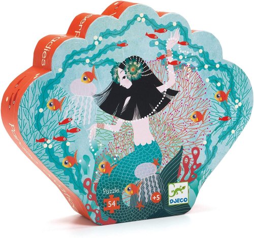 Čtvercové puzzle s motivem podmořského světa a s mořskými pannami je baleno v zajímavé krabičce.