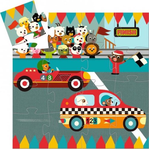 Puzzle s motivem závodního auta se zvířecími závodníky v krásné tvarované krabičce.