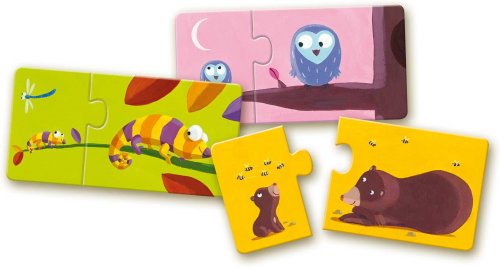 Sada jednoduchých dvojdílných skládaček s je určena pro děti, které s puzzle začínají. Velké a pevné dílky s tloušťkou cca 3 mm usnadňují dětem skládání. Skládáním puzzle si děti procvičují představivost, jemnou motoriku, koordinaci oko ruku, logické myšlení a navíc si užijí legraci. Vhodné pro děti od 3 let.