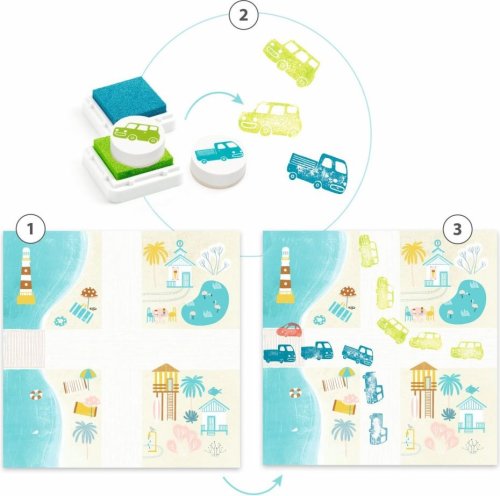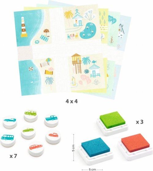 Obsah: 16 ilustrovaných karet k razítkování, 3 velké inkoustové polštářky (modrá, zelená, oranžová), 7 razítek a 1 brožurka s pokyny krok za krokem.