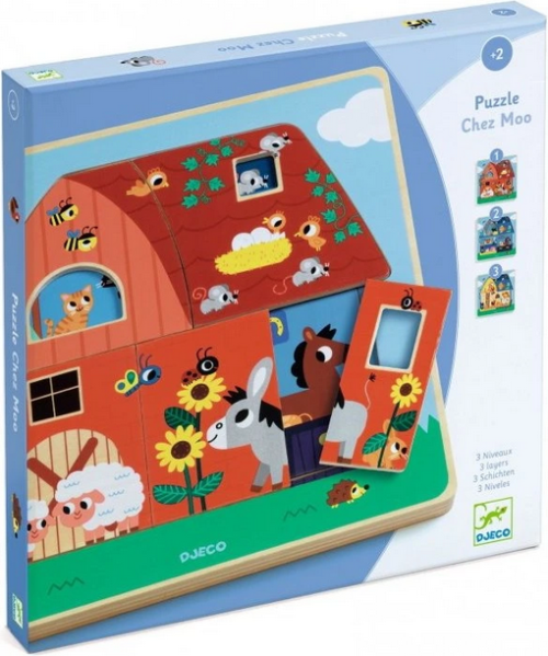 Třívrstvé dřevěné puzzle s 12 dílky, kde děti postupně odkrývají a skládají příběh zvířátek ze statku. Výhody: