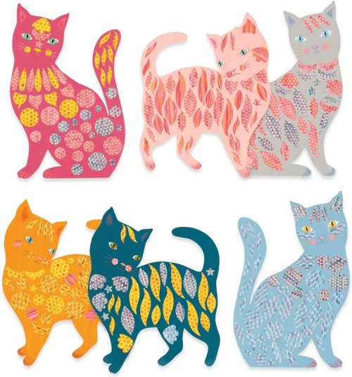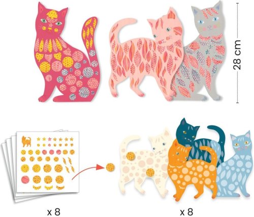 8 ilustrovaných tvarů koček ke zdobení vyrobených ze silného kartonu. 8 archů samolepek. 1 brožurka krok za krokem. Vhodné pro děti od 3 let.
