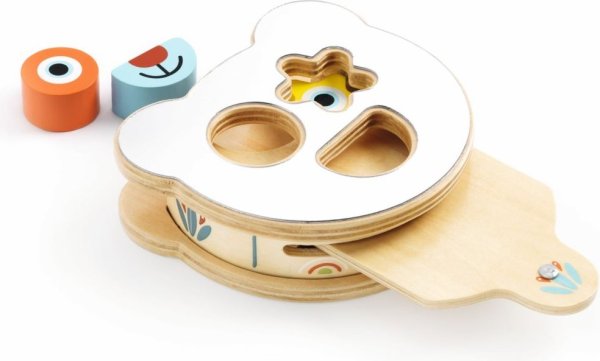děti vloží 3 geometrické dílky do odpovídajících otvorů, aby vytvořily obličej medvídka, ty pak zatáhnou za jazyk a tvary zmizí