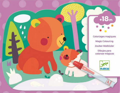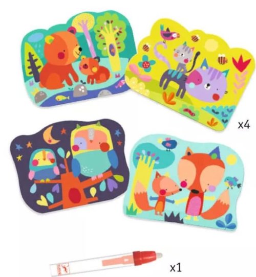 Malování s magickou tužkou s opětovně se odkrývajícími obrázky. Postavičky zvířátek medvídka, kočičky, sovičky či lišky na 4 obrázcích o velikosti 21x26cm se objeví až po přetření magickou tužkou. Tužka se před aplikací naplní vodou, která umožní objevení obrázků v pestrobarevných barvách. Krásně barevný obrázek zůstane odkrytý dokud všechna aplikovaná voda nevyschne. Po vyschnutí se opět obrázek zahalí do bílé, neprůhledné barvy a děti mohou znovu odkrývat. Nikdy nekončící zábava bude děti bavit a zaměstná je na dlouhých i krátkých cestách Sada obsahuje: 4 obrázky, magickou tužku, hadřík Vše zabalené v praktickém obalu se zapínáním, aby se i na cestách nic neztratilo a děti mohly přes průhledný obal pozorovat postupně měnící se obrázek. Vhodné pro děti od 18 měsíců.