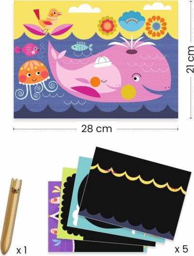Malé děti potřebují ke tvoření spoustu místa, takže zde je 5 velkých stíracích návrhů s motivem zvířat, které si mohou užít. K vyškrabávání použijí velké dřevěné oboustranné pero. Sada je vhodná už pro děti od 18měsíců. Jednou stranou pera mohou stírat velké plochy a menší detaily druhou částí s ostřejším hrotem. Děti baví odkrývat plochy a odhalovat ukryté obrázky. Je možné seškrábat celou plochu a obrázek stejně bude povedený.