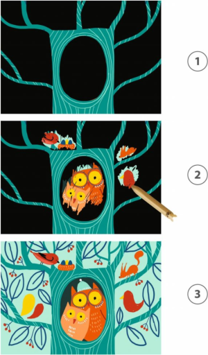 Součástí balení je velké dřevěné oboustranné pero. Jednou stranou pera mohou stírat velké plochy a menší detaily druhou částí s ostřejším hrotem. Je možné seškrábat celou plochu najednou a obrázek stejně bude povedený.