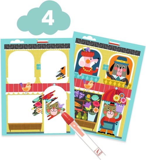 Koláž: 1 ilustrovaná karta, 1 předem nařezaná deska z tlusté lepenky a 1 tuba lepidla. Plstěná koláž: 12 desek na zdobení a 4 listy samolepicích plstěných kusů. Color Stop: 4 ilustrované listy, 1 šablona a 4 barevné tužky. Vodové barvy: 1 karta s vrstvou bílé a 1 magické pero. Odhalení barev: 3 karty k vybarvení, s magickým povlakem. Vyškrabávání: 3 karty a 1 dřevěný nástroj. 1 návod krok za krokem.