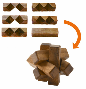 V první řadě je nutné přijít na to, jak hlavolam bez použití síly rozložit. Následně musíte přijít na způsob, jak hlavolam opět složit tak, aby držel tvar. Vhodné pro děti od 7 let.