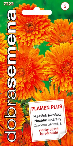 PLAMEN PLUS - měsíček s velkými, plnými květy s vysokým obsahem karotenoidů a éterických olejů. Mast i tinktura působí hojivě a protizánětlivě na kožní problémy, odvar pomáhá při nemocech žaludku, žlučníku i jater. Nenáročná, bujně rostoucí bylinka na slunná stanoviště. Sušte plně nakvetlé květy, ve stínu, při teplotách do 35°C.