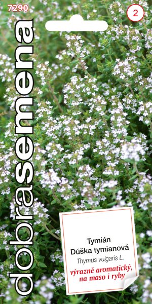 Tymián je nízký rozvětvený polokeř s protistojnými čárkovitými listy. Sklízíme nať na počátku kvetení a sušíme při teplotě do 35°C. Jako koření se přidává do polévek, omáček a k přípravě uzenin a ryb. Podporuje a upravuje trávení. Počet semen v gramu: 3000.