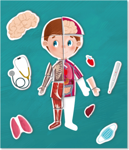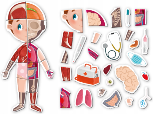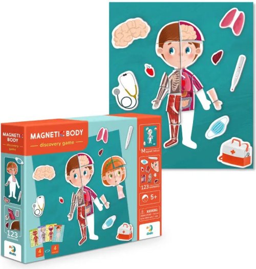 Sada obsahuje magnetickou desku (36 x 28 cm) a 123 magnetických prvků s částmi lidského těla a lékařskými potřebami. Hra podporuje jemnou motoriku, rozvoj jazykových dovedností, logické myšlení, kreativitu a představivost. Hra obsahuje kartičky s popisky v češtině a dalších 4 jazycích (angličtině, ukrajinštině, polštině, maďarštině) Magnetické hry jsou novým formátem vzdělávacích her. Vhodné pro děti od 5 let.
