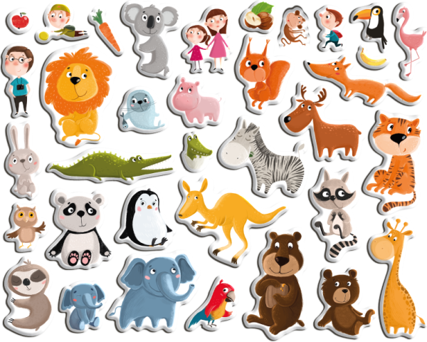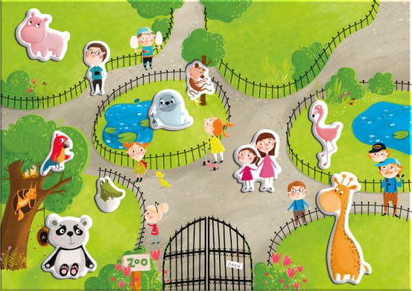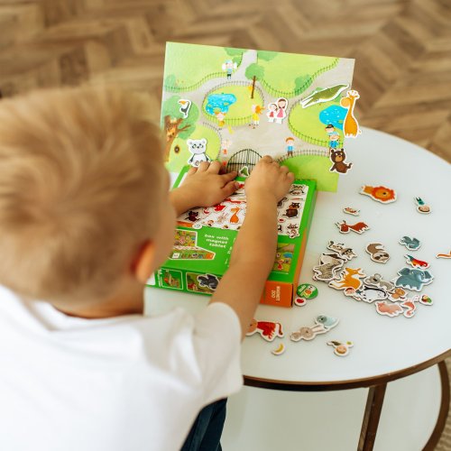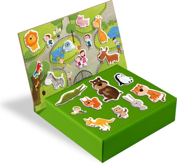 Sada obsahuje magnetickou desku a 35 magnetických prvků se zvířátky ze Zoo. Děti mohou vytvářet vlastní příběhy se zvířátky v hlavní roli a rozvíjet tak svou představivost a kreativitu. Magnetická deska je snadno přenosná, což umožňuje hru doma i na cestách. Hra podporuje jemnou motoriku a rozvoj jazykových dovedností. Krabička slouží jako stojan pro podkladovou magnetickou herní desku.