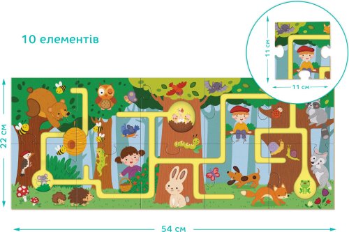 Interaktivní puzzle „Moje lesní cesta“ s 10 prvky tvoří labyrint se speciálními drážkami, po kterých dítě může vést prst a procházet trasu lesem. Ilustrace ukazuje veverky, zajíčky, ježky, ptáčky a další zvířata, která dodávají hře kouzlo. Dítě objevuje detaily a poznává lesní obyvatele. Puzzle rozvíjí jemnou motoriku, koordinaci, pozornost a představivost. Ideální pro děti od 2 let. Hravé učení a zábava v jednom!
