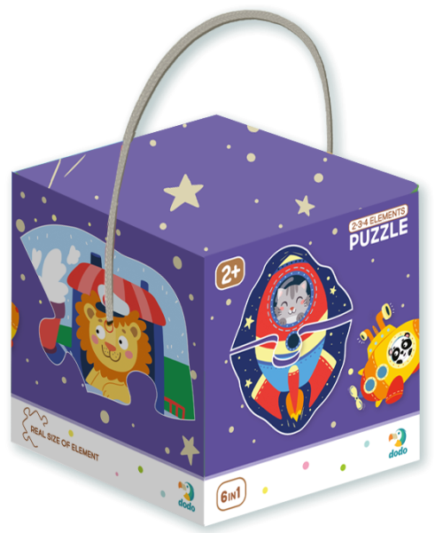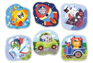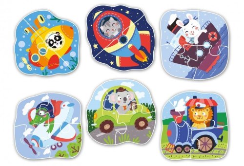 Dětské obrysové puzzle DODO s motivem šesti zvířátek a dopravních prostředků.