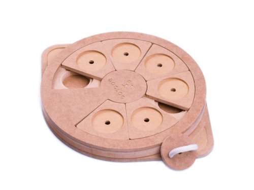 Hlavolam PIZZA light je v principu stejný jako hlavolam PIZZA, jen v ekonomičtějším provedení. I když hlavolam nemá dubové posouvací kameny, nemusíte se bát, že by si to Váš čtyřnohý parťák nemohl užít. Stejně jako u ostatních hlavolamů, hra začíná vložením odměny.